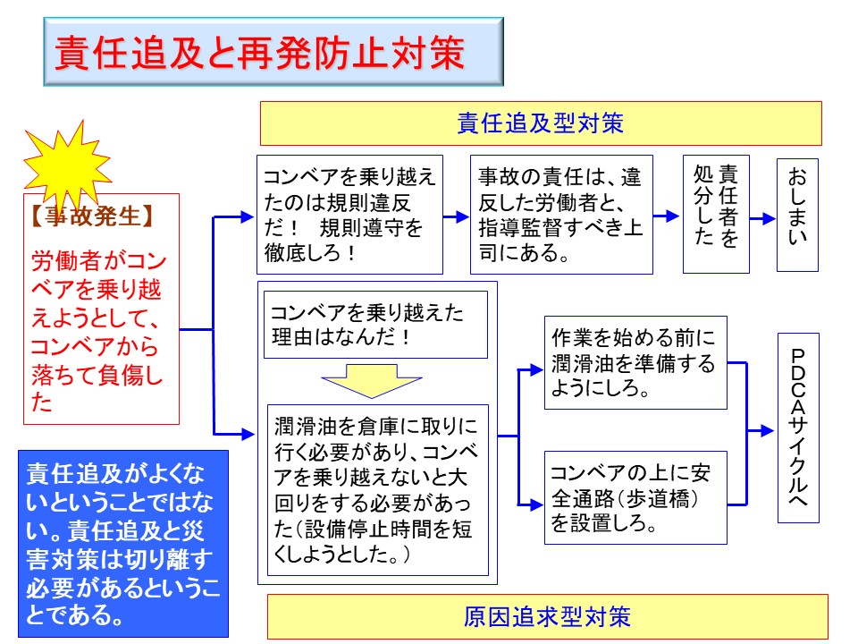 これは、コンベアを乗り越えてはならないというルール違反を労働者が犯したのが"原因"なのだから、ルール違反がないように徹底するというのは「責任追及型の対策」であって、それではだめなのだということを分かって頂くためのスライドである。