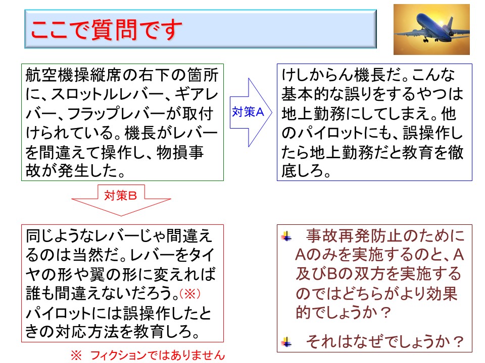 実際に、航空機でギアレバーをタイヤの形にし、フラップレバーを翼の形にしているものがある。こうしておけば、さすがに誰も間違えないのである。
