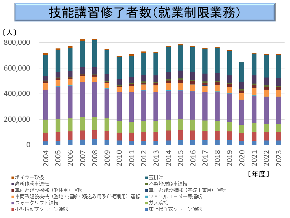 例えば、就業制限業務の技能講習修了者数の推移は次のようになっている。フォークリフト運転と玉掛け業務に関して言えば、毎年、20万部程度の販売数が見込めるのである。
