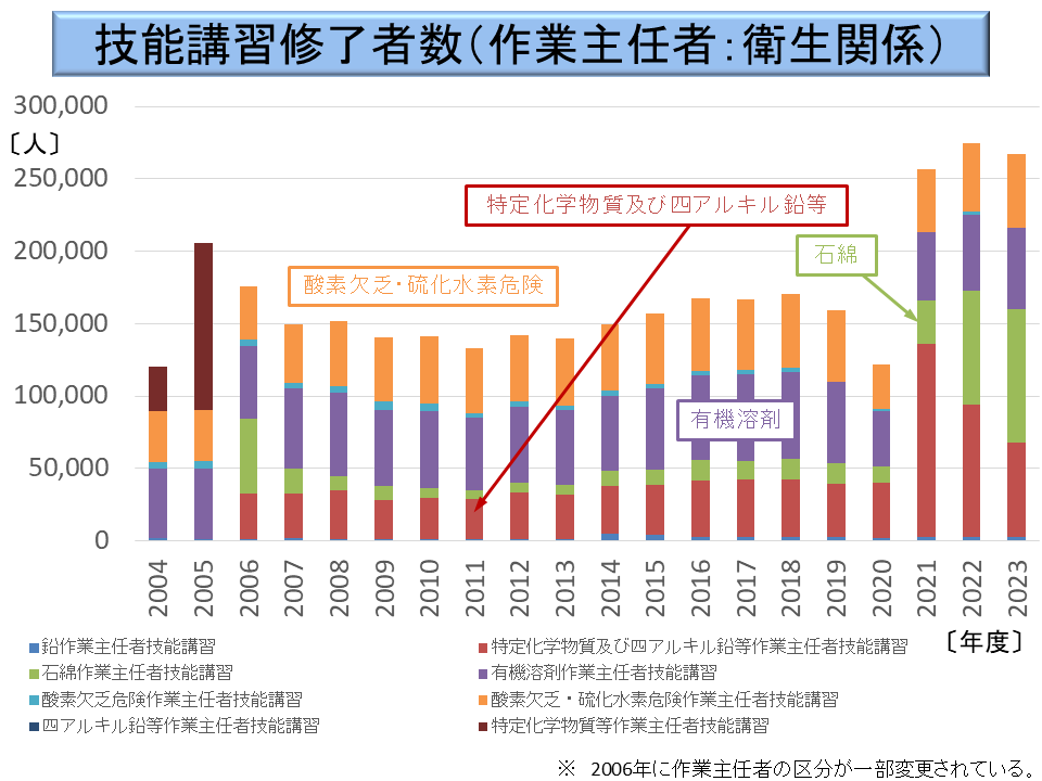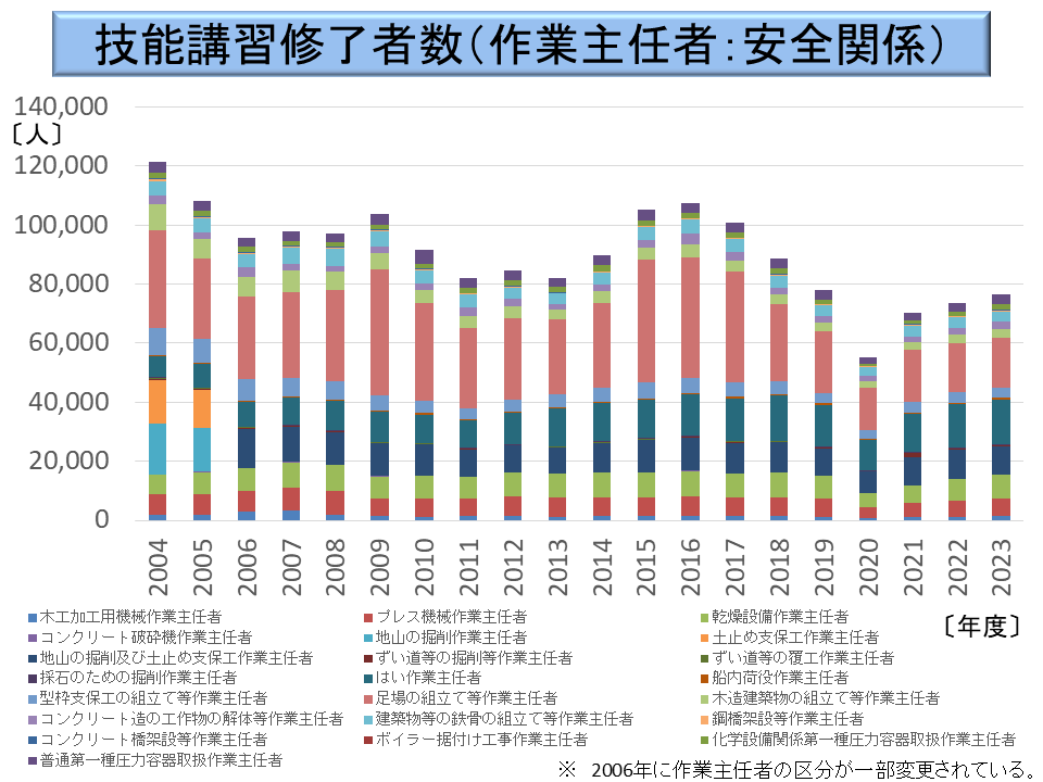 作業主任者関係の技能講習修了者数は、就業制限業務ほど多くはないが、それでも種類によっては、毎年、数万部単位で販売されるのである。安全関係と衛生関係に分けると、次のようになる。