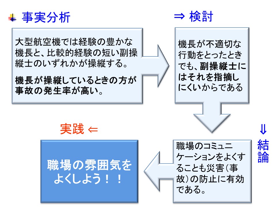 航空機事故では、副操縦士よりも機長が操縦しているときの方が事故の発生率が高いことはよく知られた事実である。事故発生後にボイスレコーダの記録を調べると、機長の操縦について、副操縦士は問題を明らかに理解していると思われる言動をしているにもかかわらず、それを機長に明確に指摘せずに大事故になるという災害が散見されるのである。
