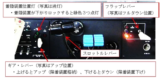 ※ 操縦席の右下の箇所に、同じ形をしたスロットルレバー(自動車のアクセルの役割)、ギアレバー(着陸装置を作動する)、フラップレバー(翼の形を変えて揚力を増す)が取付けられている。