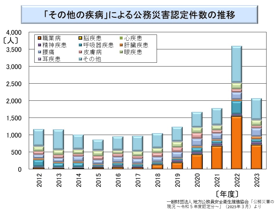 次に(一社)地方公務員安全衛生推進協会の公務災害の現況の各年版によって「その他の疾病」についての統計を示す。なお、ここにいう「その他」とは、公務上の負傷による疾病以外の疾病であることを意味している。