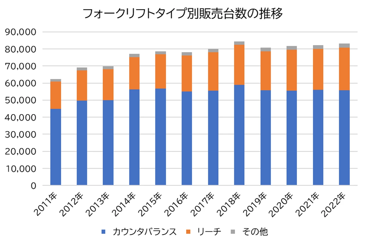 日本産業車両協会によると、フォークリフトの国内向け新車販売台数のうち、リーチフォークリフトの占める割合は3割を超えているとされています。