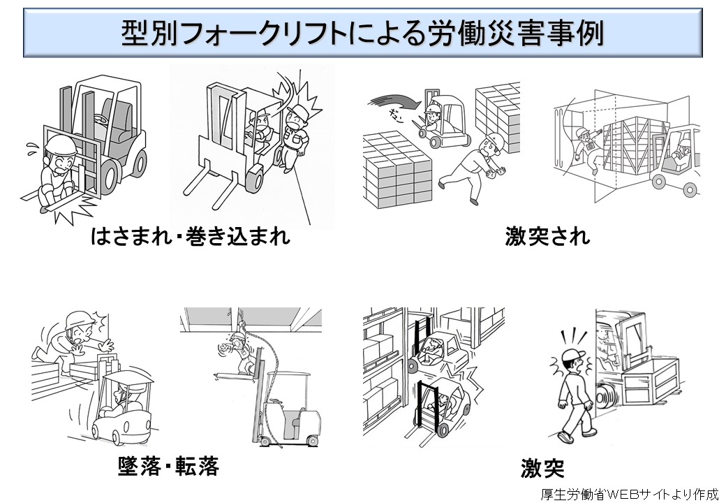 フォークリフトは、今や荷の操作に必要不可欠なものとなっている。しかし、これを起因物とする労働災害が多発しているために、安衛法でも構造規格(安衛法第42条)や、就業制限(安衛法第61条)の対象としている。