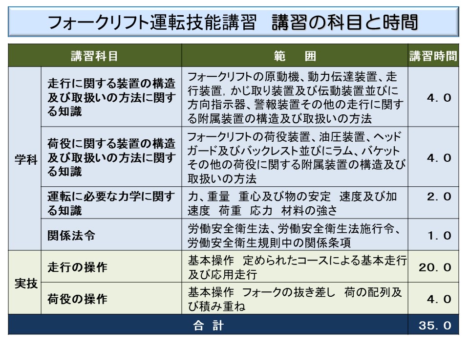 なお、学科講習の内容については、厚労省の「技能講習補助教材」の「フォークリフト運転技能講習補助教材」を参照されたい。