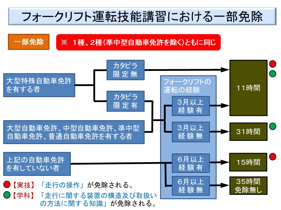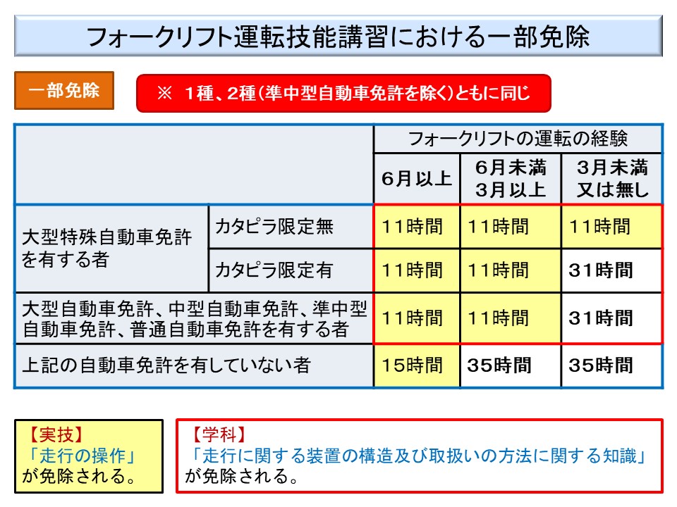 さらに、フォークリフトの実技講習では、実技の「走行の操作」と学科の「走行に関する装置の構造及び取扱いの方法に関する知識」が免除されるケースがかなり多いのである。
