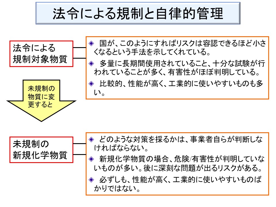 ある物質に規制がかけられたら、規制に従ってその物質を継続して使う方が、規制のない物質に代替していい加減に使うよりもはるかに安全である。