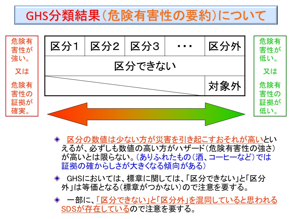 - 「法令で規制のない」ものは、危険・有害性が「ない又は少ない」ものではない。そればかりか、危険・有害性情報が「ない又は少ない」ものですらない。国内の不特定の企業での災害発生の「リスク」が「あるとは確認されていない」ものにすぎないのである。