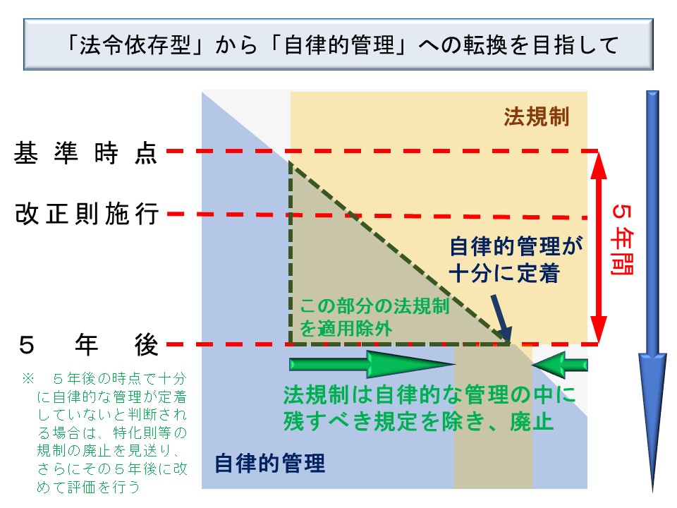 上図で説明すると、自律的な管理を5年かけて十分に定着させることとしているが、十分に定着するまでは法規制を廃止することはできない。そのため、少なくとも5年後まではそのまま適用することとなっている。