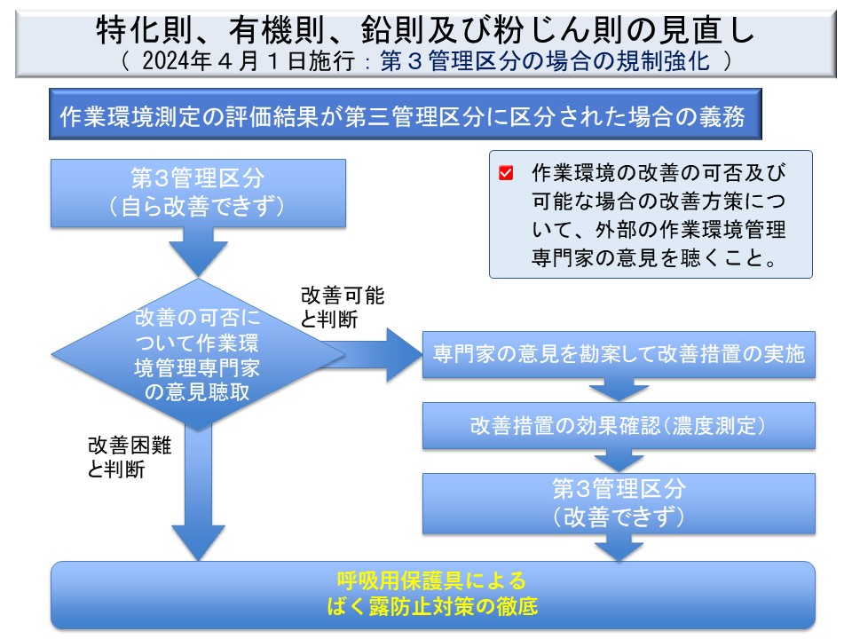 - 特化則や有機則等の特別則における、第三管理区分作業場について、作業環境の改善が困難と判断された等の場合