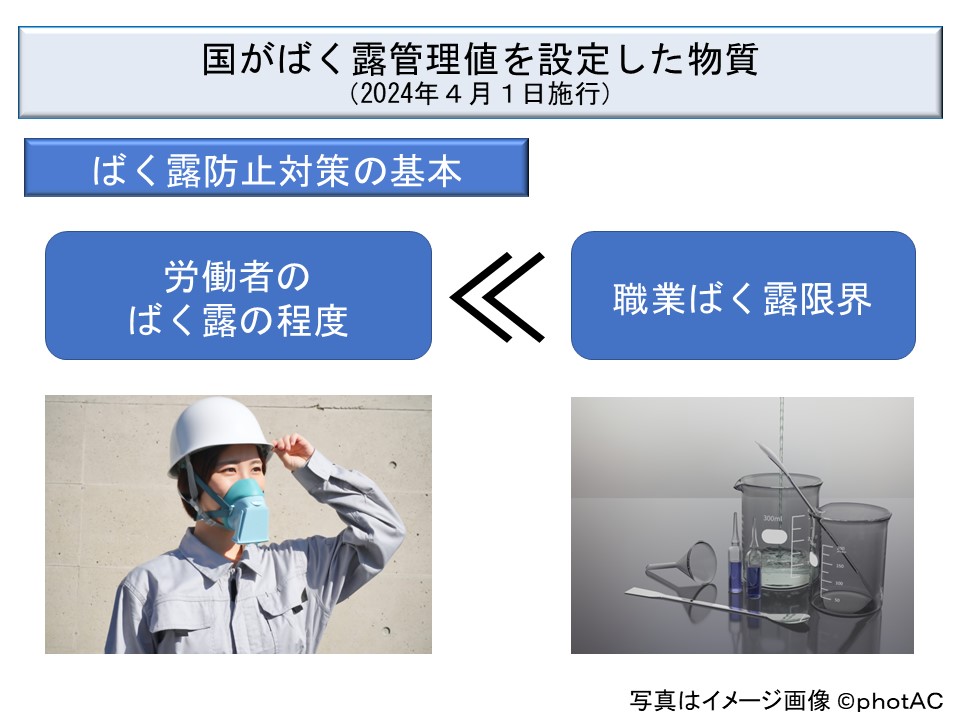国がばく露限界値を定めた物質については、2024年4月1日以降は、基本的に労働者のばく露の程度を職業ばく露限界値より低くすればよいこととなる。