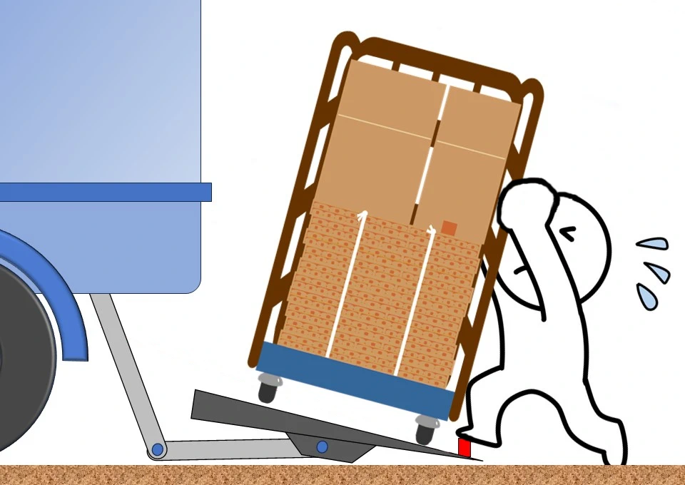 この場合、昇降板中央に1個のロールボックスパレットを載せる場合は、左右が連動して動いたとしても問題ではない。問題は、昇降板に2個のロールボックスパレットを載せる場合である。後部格納式や床下格納式のテールゲートリフターは昇降板を地上位置に下げたとき、昇降板が後ろ側に傾いているのである。