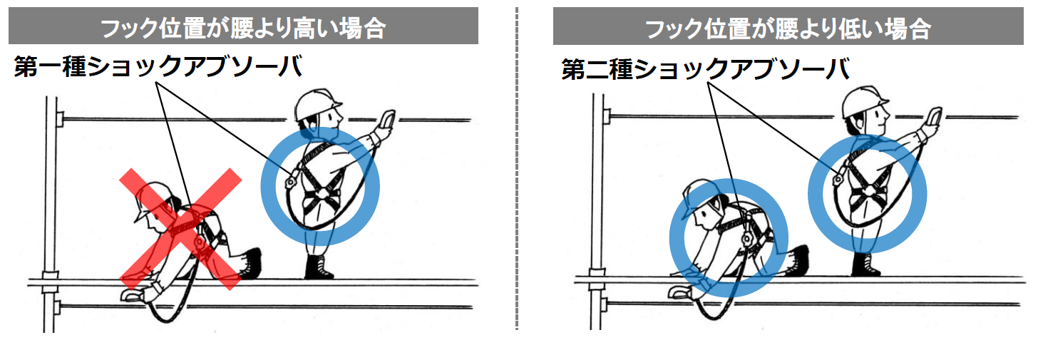 第1種ショックアブソーバは、あまり被災者の落下速度が速くなる前に止めることを前提としており、伸びきったときの長さが1.2mとなっており、一方、第2種は1.75mまで伸びる。これは、第2種ショックアブソーバのフックが低い位置にかけられることを前提としているため、自由落下距離が長くなり、ショックアブソーバが効き始めるまでに被災者の落下速度が速くなるので、これを安全に止めるためである。