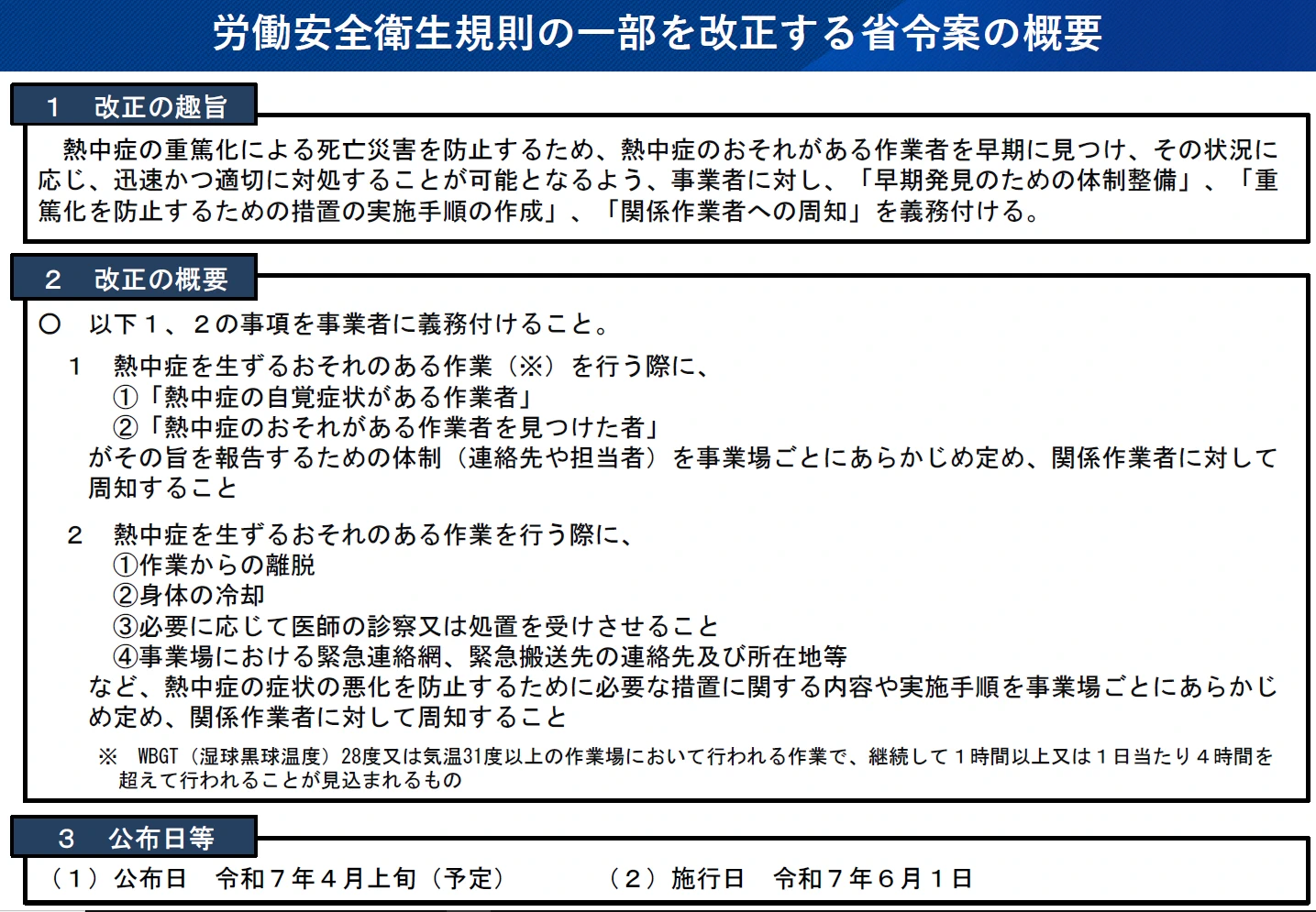 本改正における「熱中症による健康障害を生ずるおそれのある作業」とは、「WBGT 28 度以上又は気温 31 度以上の環境下で連続1時間以上又は1日4時間超の実施が見込まれる作業」であることを通達で示すことを予定しており、これに該当する作業を行う場合には本改正による措置を講ずる義務が生じます。