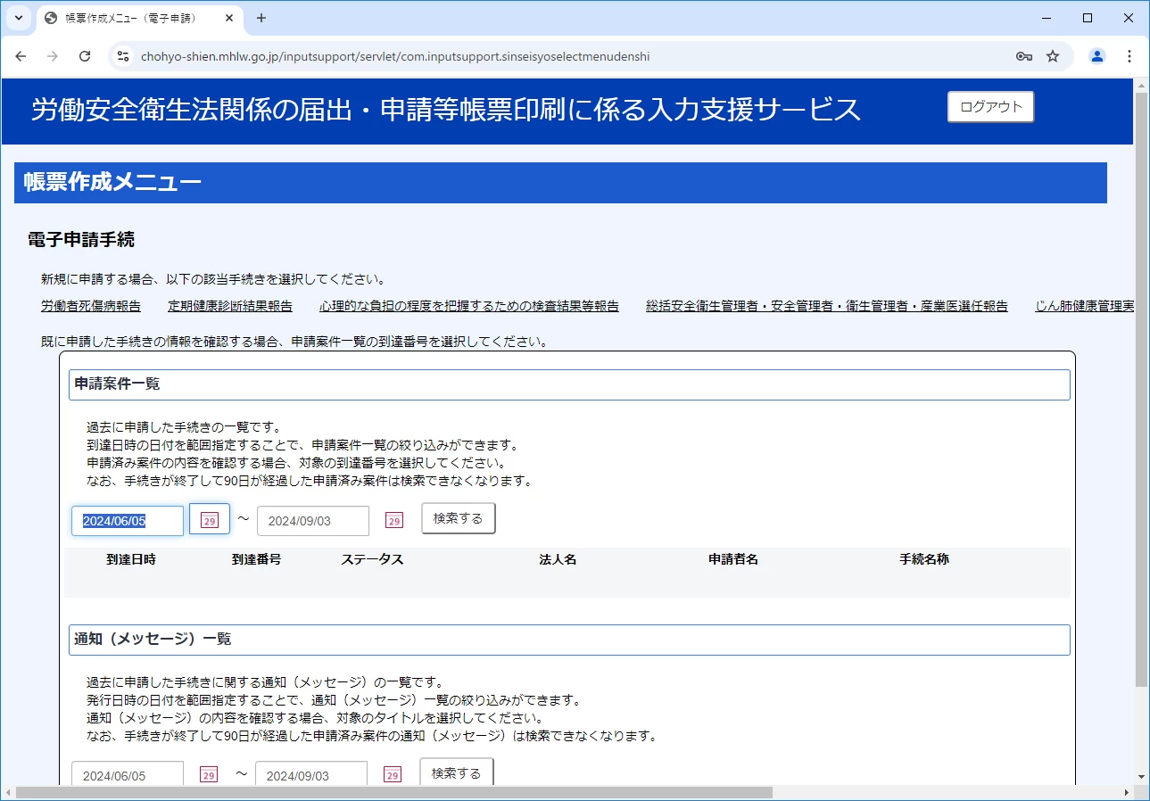 入力画面が現れるので厚労省のマニュアル「電子申請サービス利用方法」に従って入力してゆけばよい(※)。