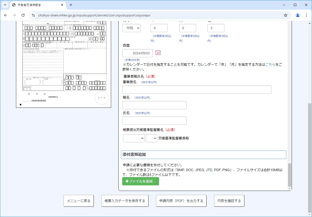 ※ 労働者死傷病報告では、図面の添付が必要になる場合が多い。合計 15MB 以下であれば5件までのファイルが添付できる。手書きしたもので構わないので、スキャンしてPDFファイルにして添付することが望ましい。カメラで撮影して jpeg ファイルにしてもかまわないが、できれば PDF の方が行政機関としては便利だろう。なお、ファイル形式はとくに制限されていないようだ。