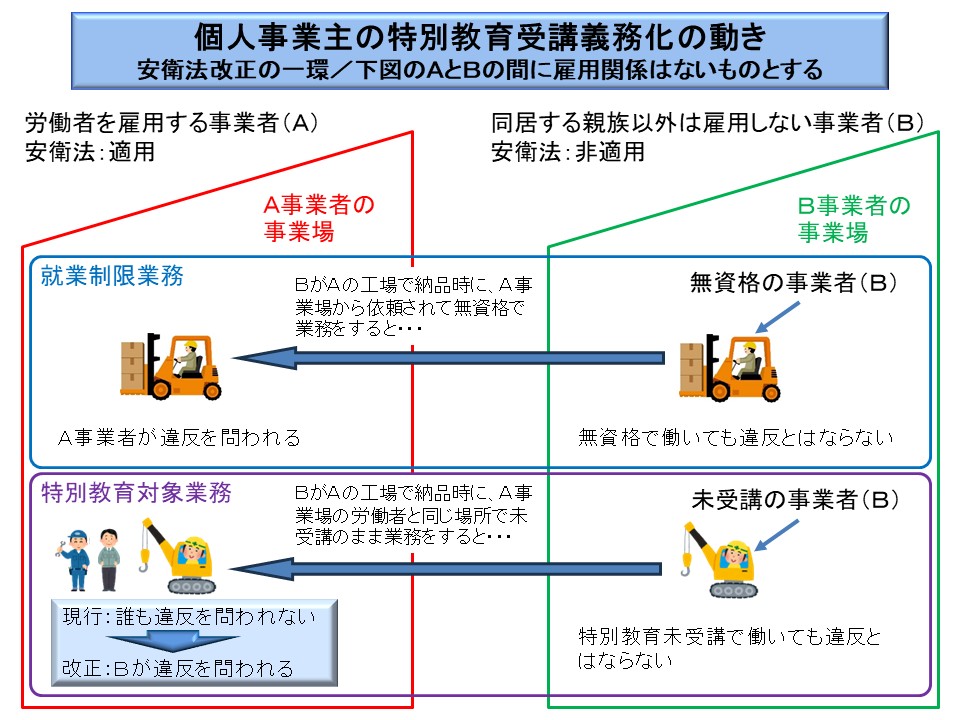 すなわち、就業制限業務とは異なり、特別教育の対象業務については、個人事業者が特別教育を受講しないまま、適用事業場でその労働者と同じ場所で同時に働くことは禁止されていなかったのである。