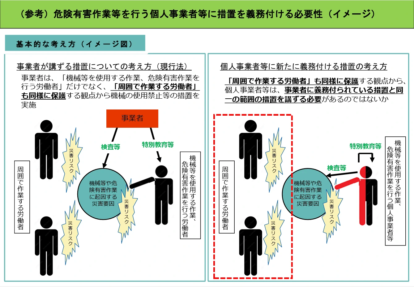この目的は、この図中に明確に示されているように、適用事業場の労働者の保護であって、個人事業者の保護ではない。仮に、個人事業者の保護を目的とするものであれば、個人事業者が本人の工場で一人で働く場合であっても特別教育の義務を課さなければならなくなるであろう。そこは、厚労省としても私的自治の原則に立ち入ることは避けたのである。