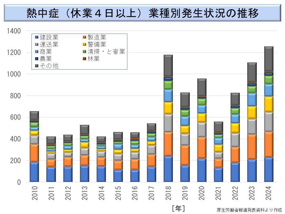ただ、本図の作業服の最大の問題は熱中症である。運送業は熱中症の発生数の多い業種である。運輸業の労働者数は建設業の半数程度であるが、2022年の熱中症の死傷者数は建設業とほぼ同数が発生している。
