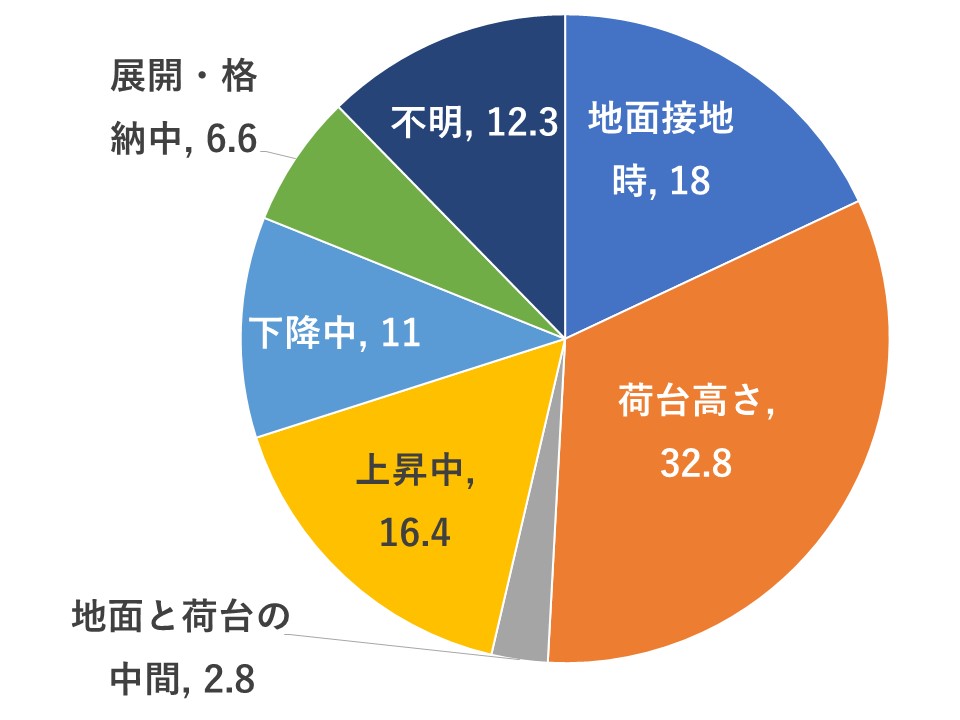 そこで、災害の発生したときの昇降板の位置を見ると、「荷台高さ」がもっとも多く3分の1以上を占める。また、「上昇中」と「下降中」を合わせると3分の1近くとなる。