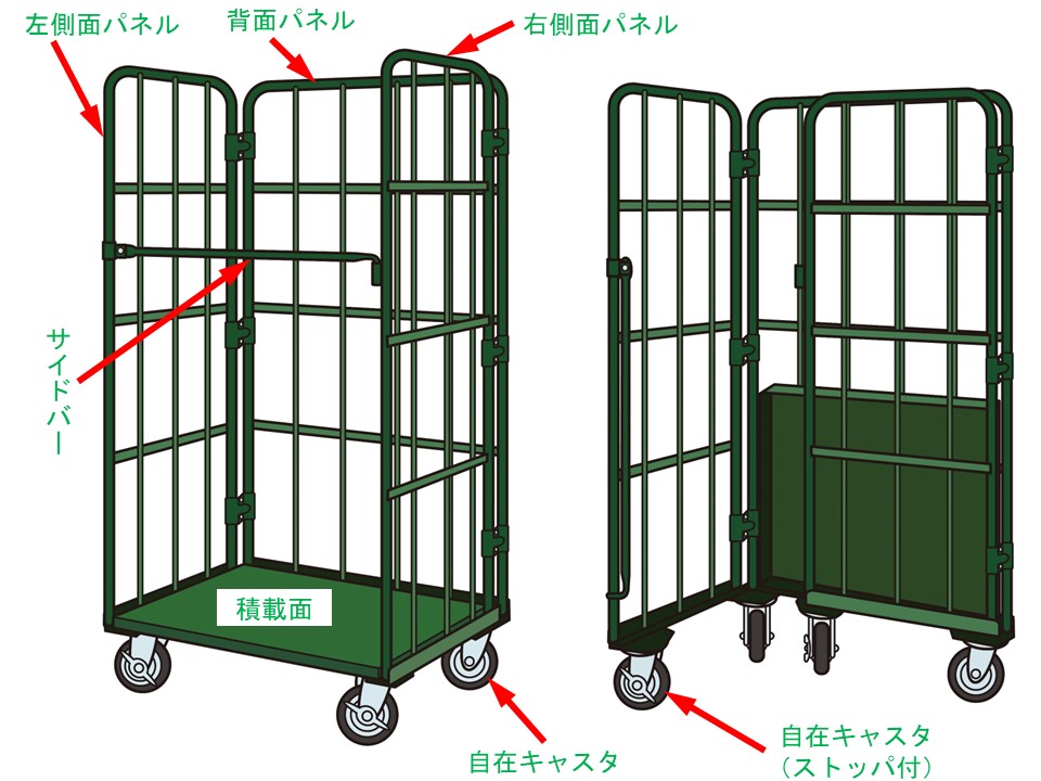 ロールボックスパレットとは、右図のような台車で、カゴ車とかカゴ台車などとも呼ばれている。保管時の折りたたむ方法によって、L字型とU字型(A字型)に分けられる。図はL字型で、右側のパネルがたためるが左側のパネルは背面パネルに固定されていてたためないようになっている。U字型は左右のパネルがたためるが、キャスタ部をたたむことはできない。