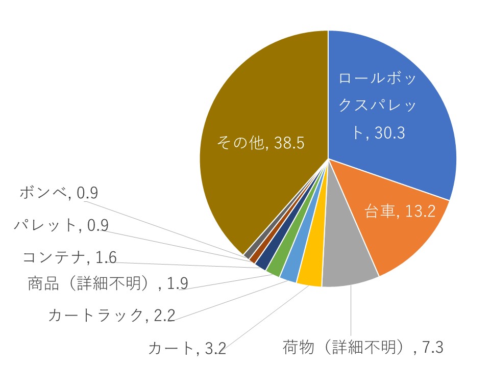 次に多いのが「荷・作業者の転倒・転落による下敷き等」である。ロールボックスパレット(カゴ台車)のような荷を作業者が扱っているときに、荷が倒れて作業者が下敷きになったものである。ロールボックスパレットのような背が高い荷は、必然的に重心が高くなって倒れやすいばかりか、かなりの量の荷が積めることから下敷きになると重症化しやすい。