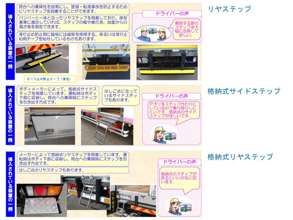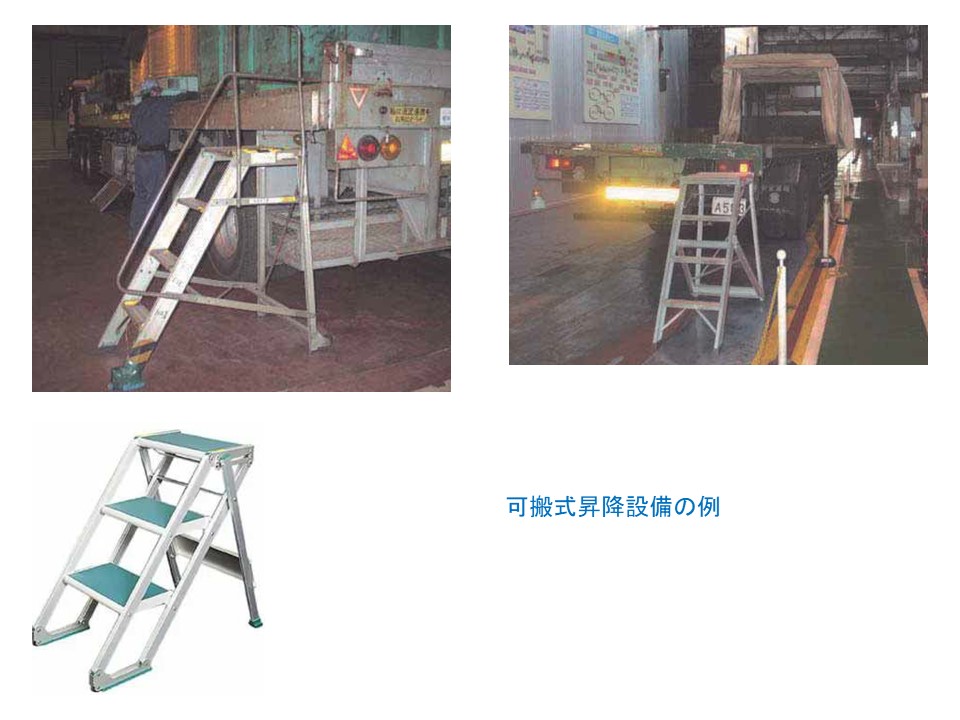 可搬式の昇降設備については、手すりのあるもの、踏板に一定の幅や奥行きのあるものが望ましい。また、貨物自動車に設置されている昇降用のステップについては、乗降グリップがあり、三点支持等により安全に昇降できる形式のもの等が望ましい。