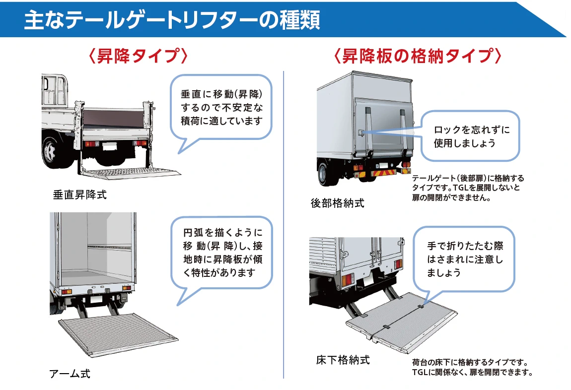 ※2 床下格納式の場合、テールゲートリフターを完全に展開しなくても、折りたたんだままの昇降板を床下から後方に突き出して昇降設備として使用できるようになっているものもある。