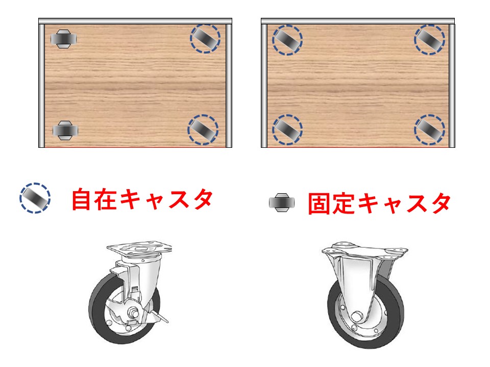 そこで、比較的広い場所で直進する作業が多い場合は、4輪の自在キャスタのうち2輪を固定キャスタに変更することが望ましい。一部のメーカは4輪自在しか作成していないが、注文に応じて2輪を固定キャスタにする場合もある。また、4輪が自在キャスタで、そのうちの2輪は自在と固定の切り替えができるようになっているものもある。