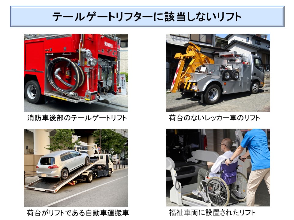 なお、法令ではテールゲートリフターは「貨物自動車の荷台の後部に設置された動力により駆動されるリフト」とされている。従って、自動車検査証の用途区分等(※)、他法令に基づく分類や最大積載量に関わらずこの定義に該当すれば適用される。自動車検査証において、用途等の区分が貨物自動車等となっているものや、自家用・事業用の別が事業用となっているものに限定されない。一方、貨物自動車以外の自動車等に設置されているテールゲートリフターや、介護用の車両に設置されている車いすを対象とする装置等には適用がない。