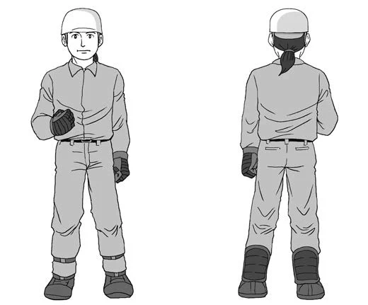 図は、労働安全衛生総合研究所が、陸上貨物運送事業の標準的な服装・装備の例として上げている図である。手と足首にはプロテクタが取り付けられている。このプロテクタは、ロールボックスパレットの操作を念頭においたものである。