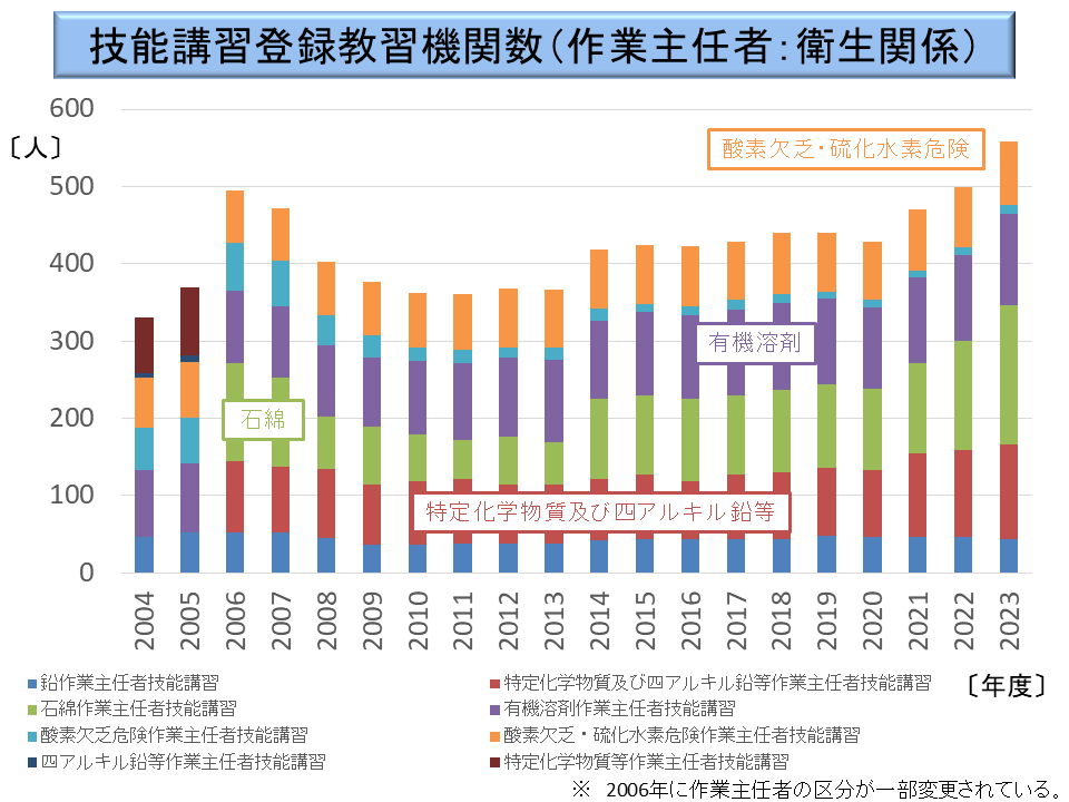 現行法制度の下では、有機溶剤業務の一部(有機則第19条)、特定化学物質の製造・取扱業務の一部(特化則第27条)等を、事業者が労働者に行わせる場合には、技能講習を修了した者の中から作業主任者を選任しなければならない。そのため、化学物質関連の作業主任者の技能講習の受講者数は極めて多い(※)。