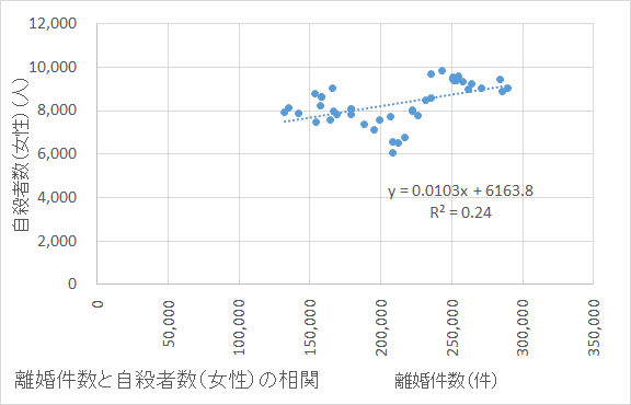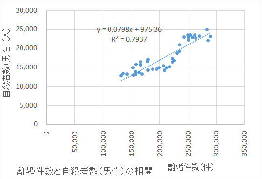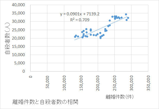 離婚件数は年間に数十万件程度であることから考えれば、自殺者数に占めるその年に離婚した者の割合がそれほど大きいとは思えない。すなわち、離婚した者が自殺するから図のような結果になるということではない。(他人の)離婚件数が増えると、離婚していない者の自殺者も増えているということなのである。