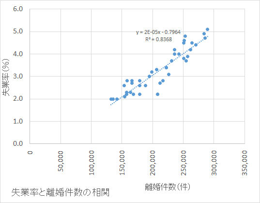 この相関係数R2は0.837とおどろくほど高い。なお、これは離婚した夫婦は、いずれか一方が90.5%の割合で失業しているという意味ではないし、夫が失業した夫婦のうち90.5%が離婚するという意味でもないのでご留意頂きたい。なお、この点について、村上(※)は、「t時点に夫が「失業」した家族のうち、5%がt+1年度に離婚している
