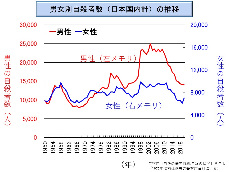 ここから先は、たんなる仮説であって根拠はないが、自殺件数の変動には長期的な波と短期的な波があり、長期的な波には男性のみに顕著に現れ、短期的な波は男性、女性双方に同様に現れるようだ。そして、この長期的な変化に男性は耐えられなかったが、女性は耐えられたということではなかろうか。