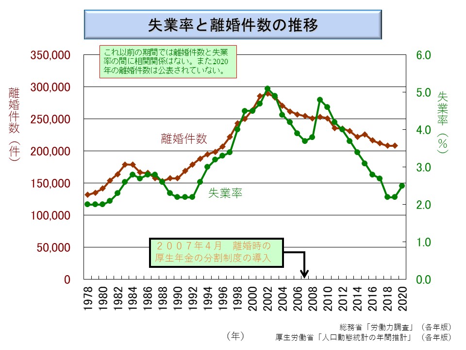 これは、これ以前の時期では、かつての社会的な因習や女性の経済的な実力の不備のために離婚が難しかった時代から、そのような難しさが減少して、女性に離婚という選択肢が時系列的に増加していったためであろう。そして、それによる増加率が大きすぎて、他の要因との相関が分からないためであろうと思われる。