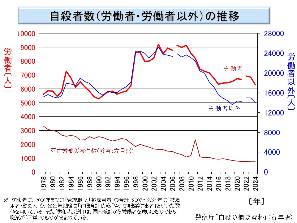 下図は、私のサイトに掲示したもので、自殺者数を労働者と労働者以外に分けてグラフ化したものである。